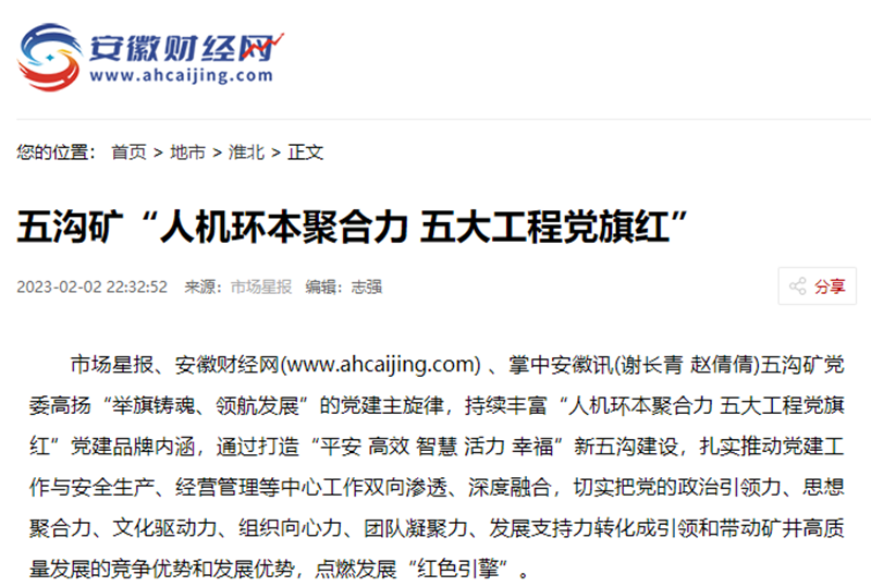 2月2日安徽市场星报、安徽财经网:五沟矿:人机环本聚合力 五大工程党旗红