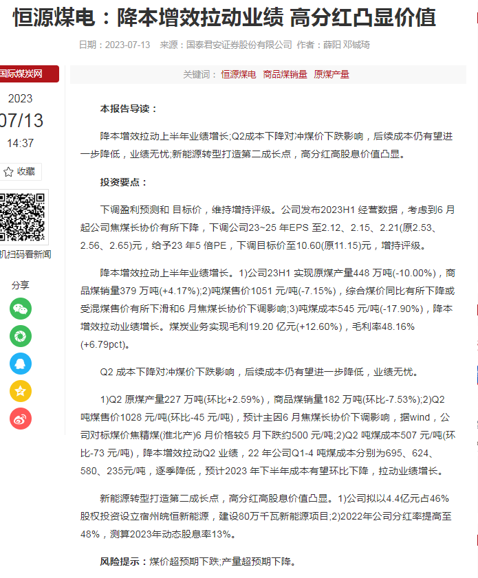 国际煤炭网:金年会体育煤电降本增效拉动业绩 高分红凸显价值