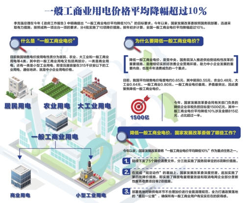 李克强总理在今年《政府工作报告》中明确提出“一般工商业电价平均降低10%”的目标要求。今年以来,国家发改委按照国务院部署,迅速采取有力措施,按照成熟一项出台一项的政策,分4批实施了10项降价措施。按年初步计算,全国一般工商业电价平均降幅超过10%。